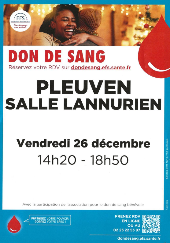 Le Vendredi 26 Décembre, l’Etablissement Français du Sang, avec la participation de l’association pour le don de sang de Fouesnant, organise une collecte de sang à PLEUVEN de 14h20 à 18h50 à La Salle Lannurien